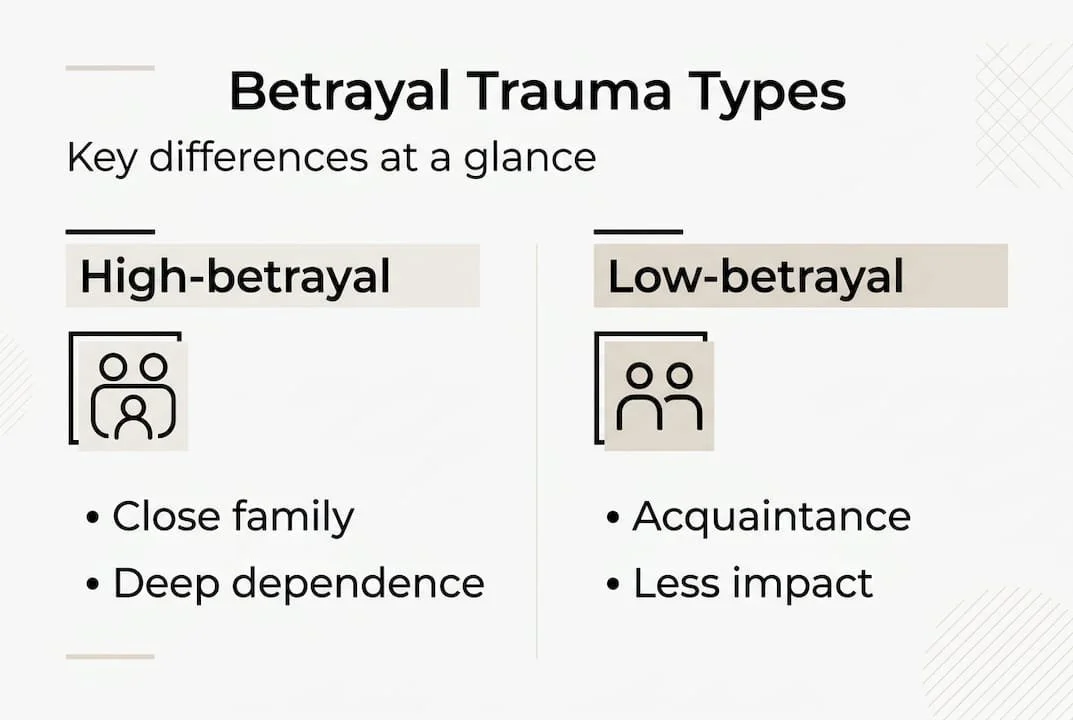 High-betrayal trauma comes from people you were most dependent on: parents, romantic partners, close family. Low-betrayal trauma involves people with less relational power over you: acquaintances, coworkers, distant relatives.