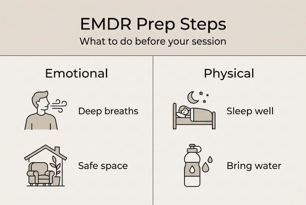 Physical preparation makes a significant difference in how comfortable you feel during EMDR. Get enough sleep the night before your session so you can stay focused and emotionally regulated. Stay hydrated and eat a light meal or snack beforehand to maintain stable energy levels. Wear comfortable, non-restrictive clothing that helps you feel relaxed rather than self-conscious.