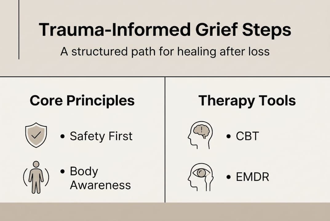 The first step is assessing your readiness and ensuring a safe environment before structured therapy begins. Trauma-informed therapies start with this foundation because processing grief without adequate safety can increase distress.