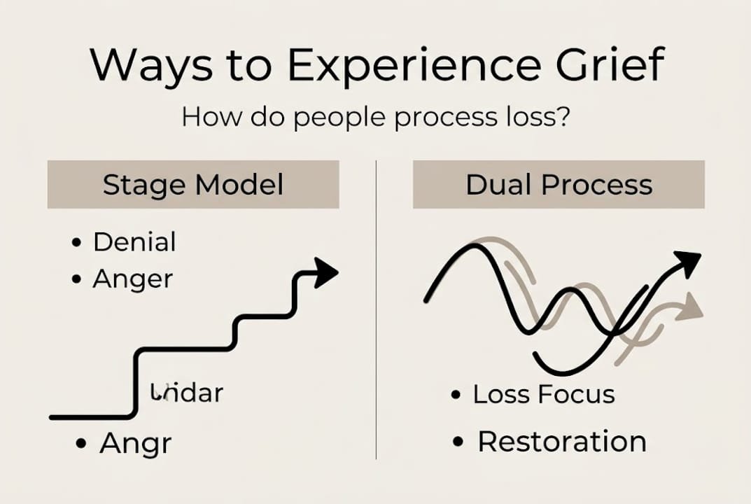For decades, stage-based models dominated how people thought about grief. The idea was that you move through predictable phases and eventually reach acceptance. The problem is that this framing can make people feel like they are doing grief wrong if they do not follow the sequence.