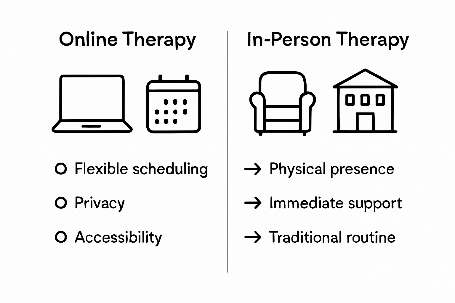 Each therapeutic approach offers distinct benefits and potential challenges. In-person therapy provides immediate, tactile environmental cues and allows therapists to observe subtle body language signals, while online therapy eliminates geographical barriers, reduces transportation stress, and offers greater scheduling flexibility. The choice between modalities often depends on individual preferences, comfort levels, and specific mental health requirements.